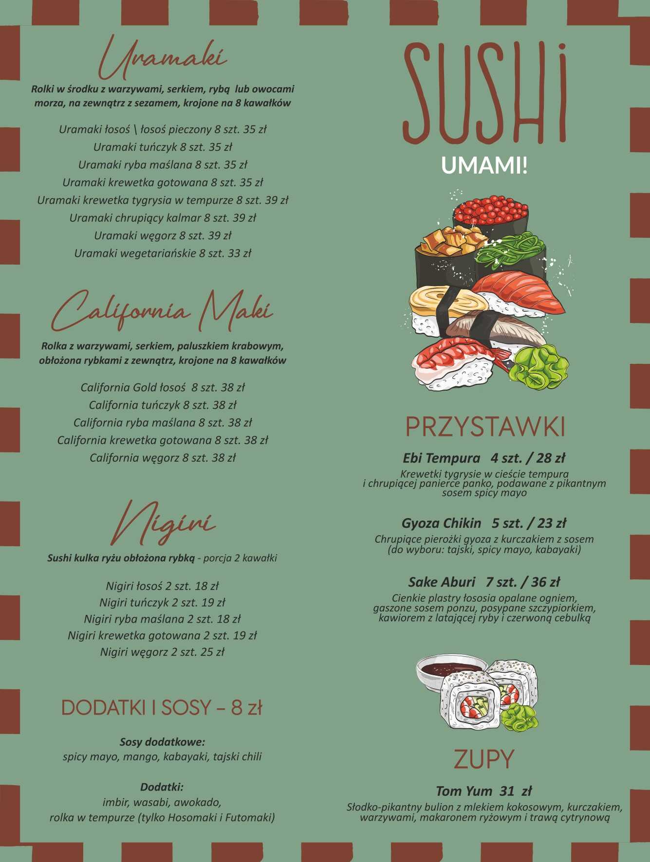 Nasze menu UMAMI! – Pniewy, ul. Wolności 36/1 Menu obiadoweSushiPizza Serdecznie Zapraszamy na wyjątkową podróż kulinarną przejdź do kontaktu